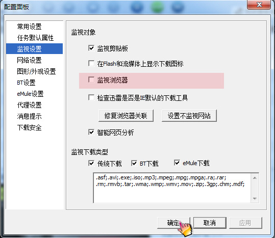| 下一步:把紅色部分‘監(jiān)視瀏覽器’選項(xiàng)前面的正方形保持未選擇狀態(tài)如下圖,然后點(diǎn)擊最下面的‘確定’按鈕,完全退出迅雷軟件,重新點(diǎn)擊‘源文件下載’按鈕即可完成下載操作。 |
