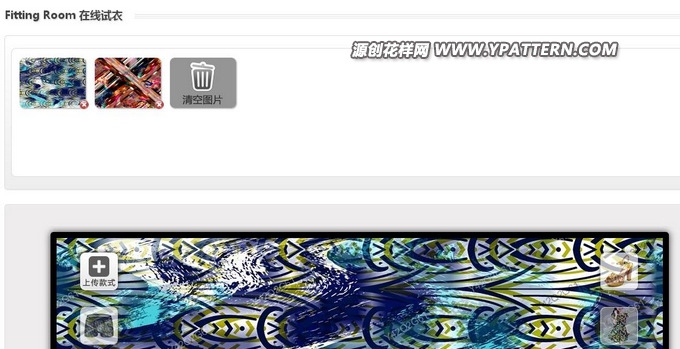 2.在試衣操作區(qū)的右下角,點(diǎn)擊ldquo;上傳花樣rdquo;按鈕,上傳你自己的花樣。上傳后的花樣,會(huì)在試衣操作區(qū)的上方顯示。