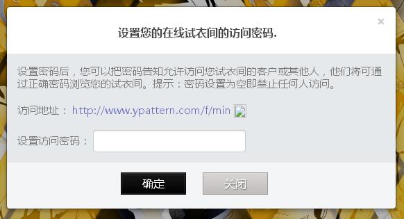 7.當(dāng)你上傳的花型是想給你的客戶看時(shí),你還可以設(shè)置你試衣間的密碼。你試衣間的訪問(wèn)地址就是彈出框的地址,密碼就是你剛剛設(shè)置的。只要你將這個(gè)試衣間的地址和密碼告訴你的客戶,你的客戶就可以很方便的看到你的花型并能更真實(shí)體驗(yàn)在產(chǎn)品上的效果。