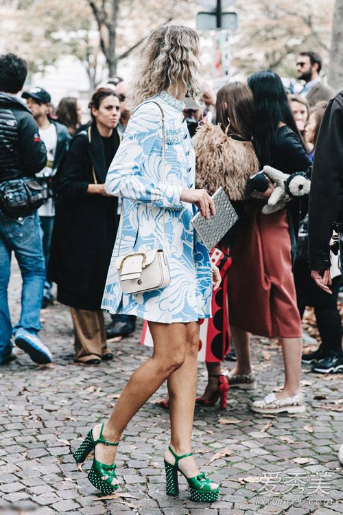 藍(lán)底白花的印花外套清新極了,就像春天的晴空一樣,藍(lán)天白云妙不可言,搭配綠色高跟鞋和白色包包,滿滿都是春日氣息。