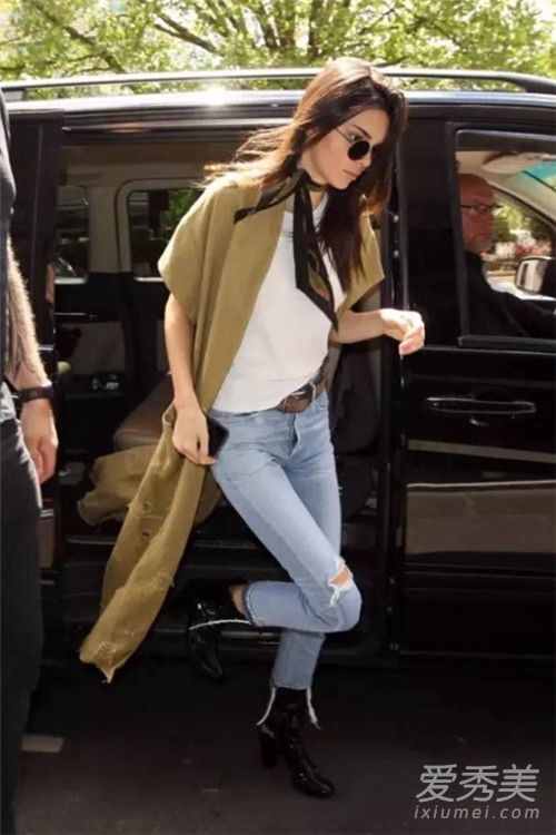 肯豆穿中長(zhǎng)款短袖外套配白T恤和牛仔褲,踩著黑色粗跟短靴,帥氣利落,頸間的絲巾系出女人味。