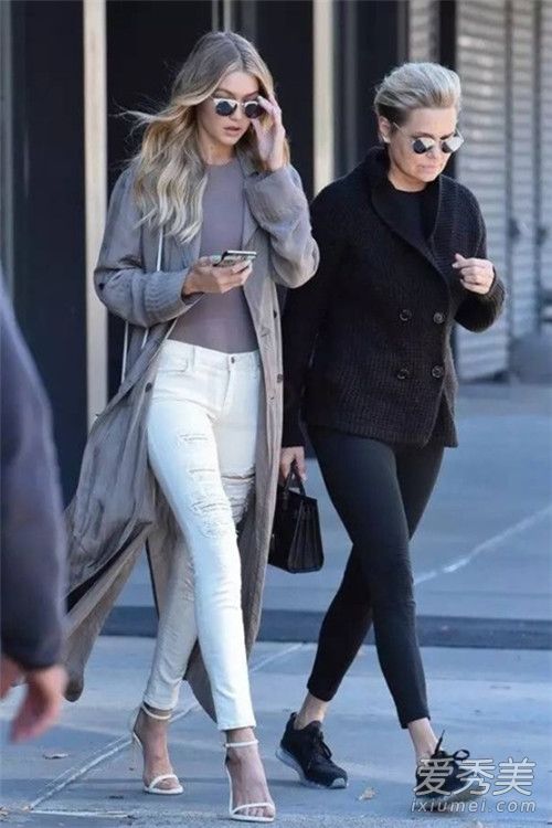 吉吉-哈迪德穿灰色風(fēng)衣配灰色打底衫和白色九分褲,踩著白色高跟鞋,利落優(yōu)雅,開(kāi)叉剪裁的風(fēng)衣更顯風(fēng)度。