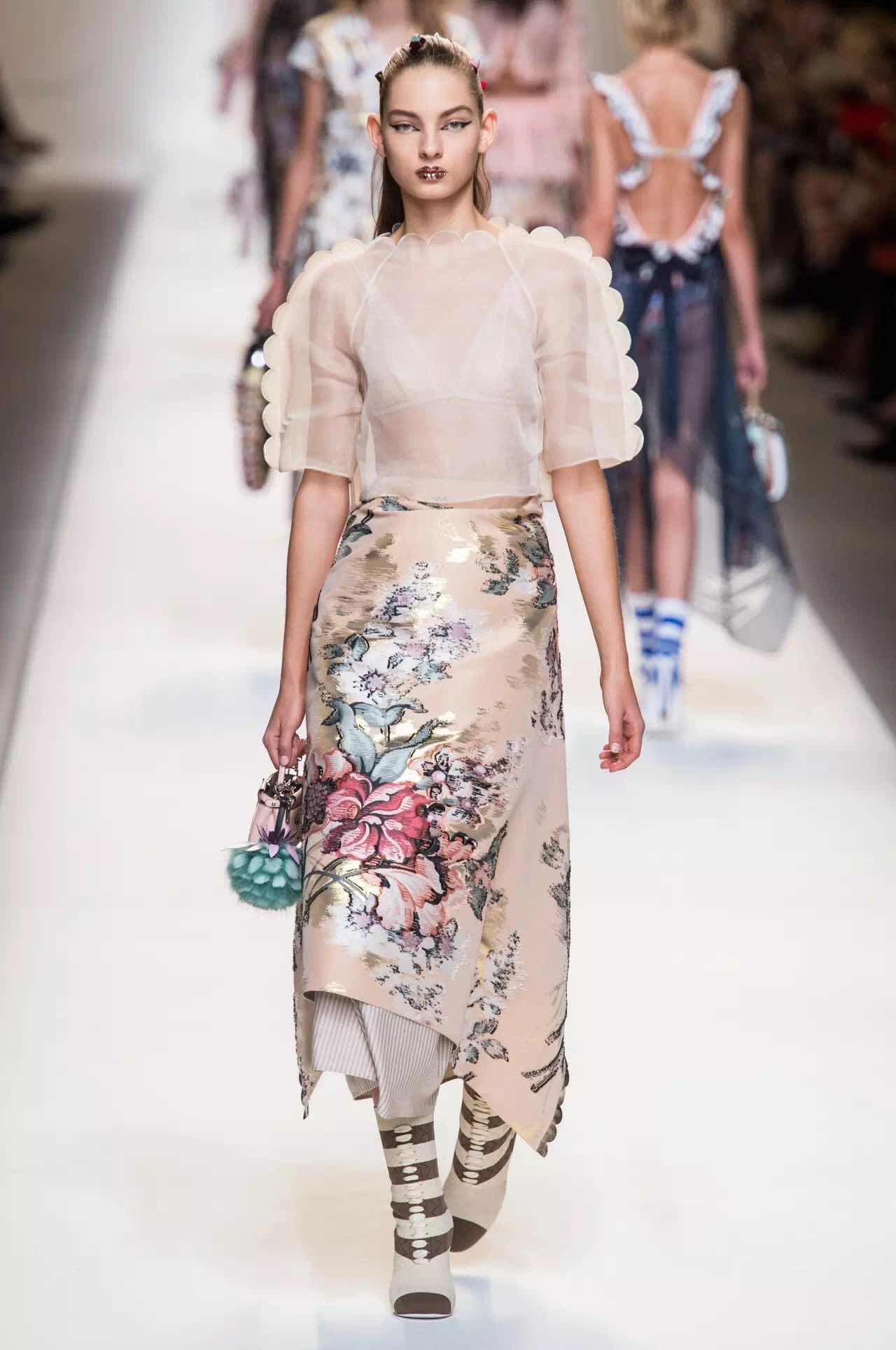 花卉依然是春夏季的關(guān)鍵花紋,米蘭時(shí)裝周上依然是百花齊放的熱鬧場(chǎng)面,不過(guò)值得關(guān)注的是,在這里所有的花卉都像是被進(jìn)行了夸張版本的放大,設(shè)計(jì)師們運(yùn)用芙蓉花卉和棕櫚葉花紋向該主題致敬。Ports 1961將五彩繽紛的大朵花卉作為設(shè)計(jì)的重中之重,也為原先的深色調(diào)添加了幾分明艷;Fendi是將花卉以工筆畫(huà)的方式勾勒于裙身上,在淺粉色調(diào)的基礎(chǔ)上有著浪漫的情調(diào);Max Mara的棕櫚葉紋成為了套裝的招牌,飽和度極高的綠色,是春夏活力的代表。