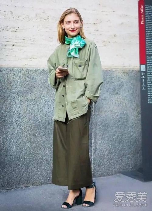 單一的草木綠軍裝風大衣就很好看,怕過于凌亂就選擇一件單品就好。