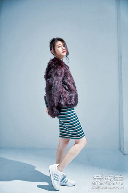 球鞋讓整體,不性感過頭,貼身裙 皮草容易太惹火,踩上球鞋就不會(huì)好艷麗,變成平常也可穿的搭配。