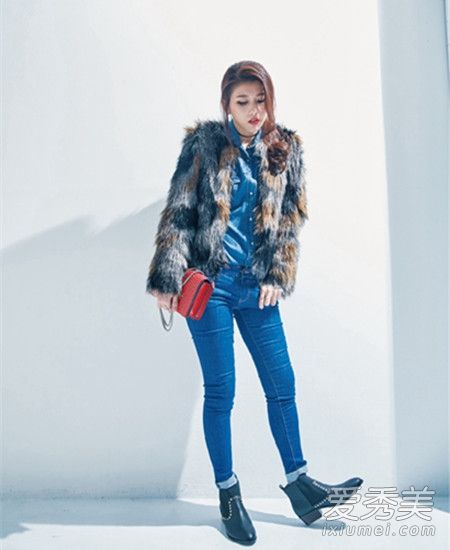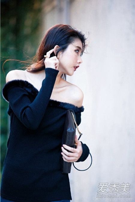 露肩上衣女人味十足,領(lǐng)子特別滾了一圈皮草,看起來好有冬天FU,搭上牛仔褲減弱美艷感。