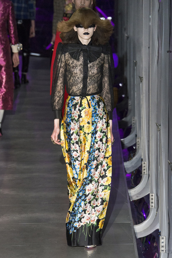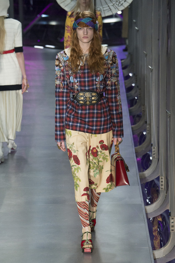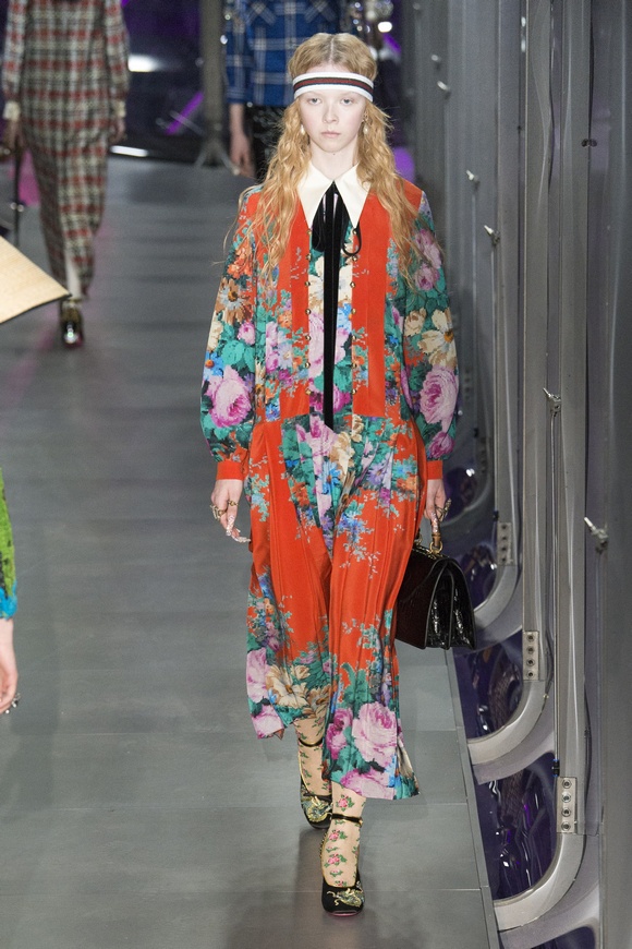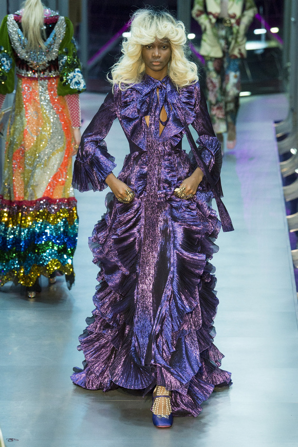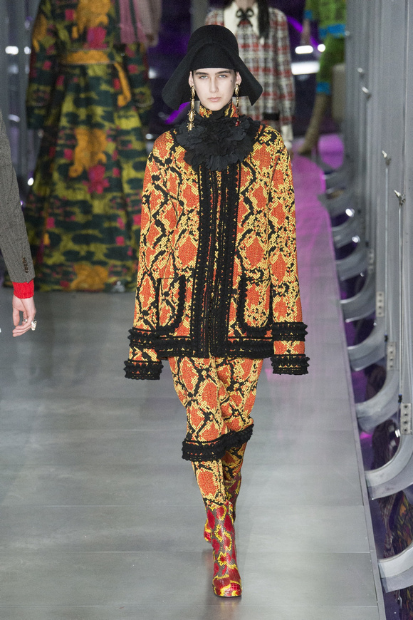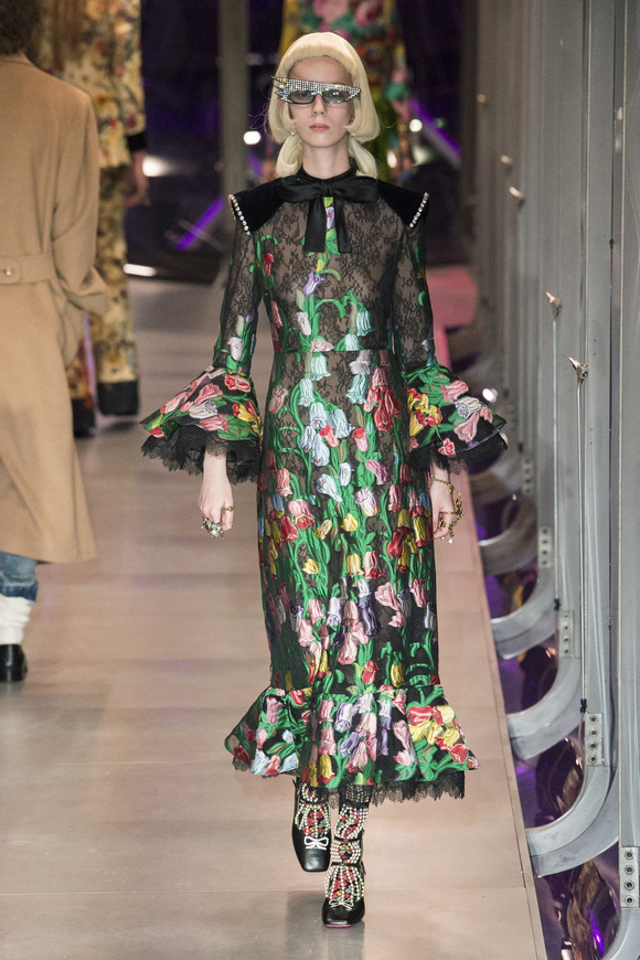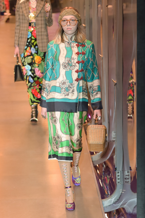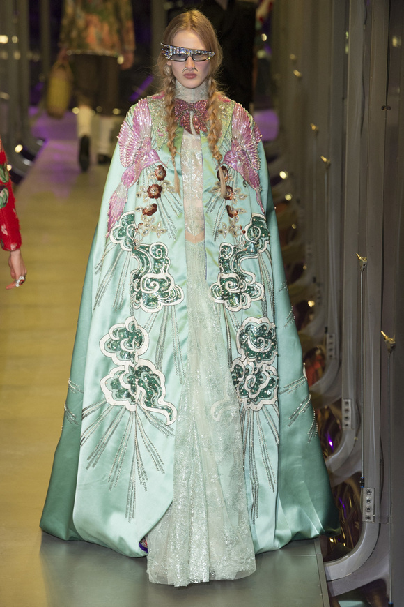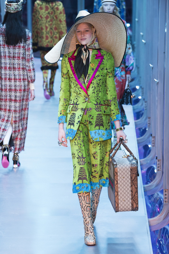古馳這一季的發(fā)布會(huì)布置成一個(gè)充滿植物和動(dòng)物的秘境,園里棲息著乞靈和召喚古老世界的符號(hào)、標(biāo)記和原型。在這秘境之地,好奇的雙手把玩各種物質(zhì),將其和虛無(wú)縹緲融合為一體,以細(xì)膩與歡愉的直覺(jué)為其鑄型。正如在煉金師的實(shí)驗(yàn)室中,所有物質(zhì)都得被精挑細(xì)選、分離解析,以及處理研究。這個(gè)創(chuàng)作的節(jié)奏總是在經(jīng)歷漫長(zhǎng)的孵化后突然頓悟,整個(gè)過(guò)程就像是奇情幻想威力搶灘了現(xiàn)實(shí)慣性。