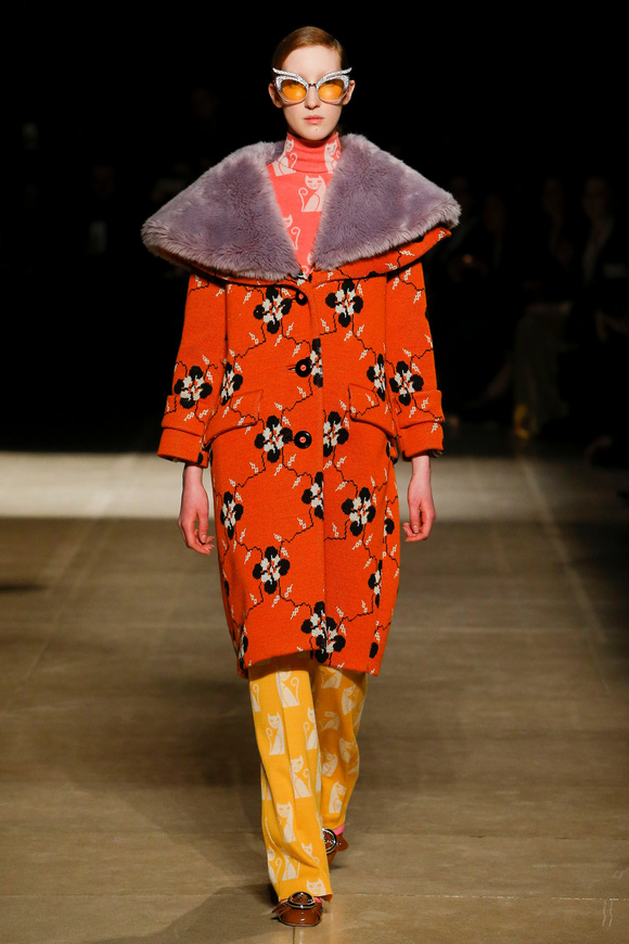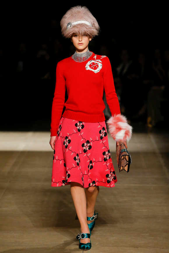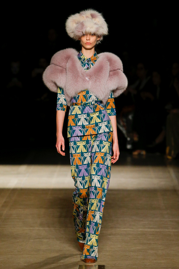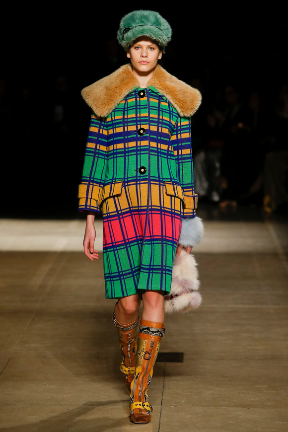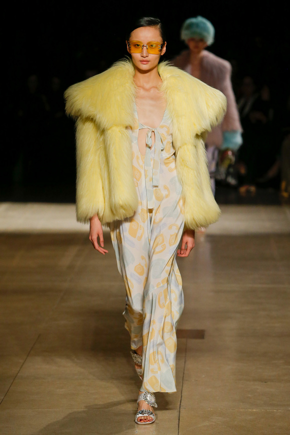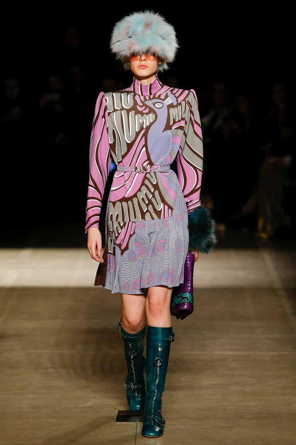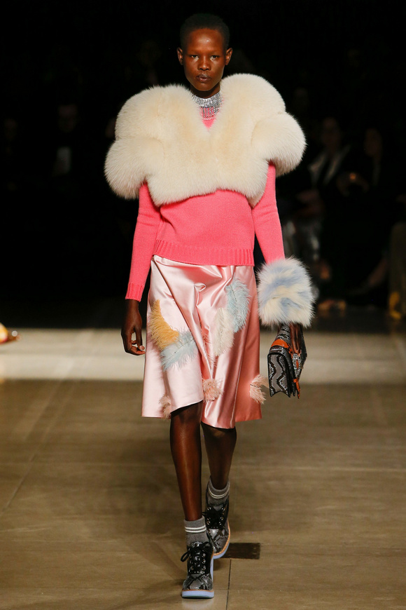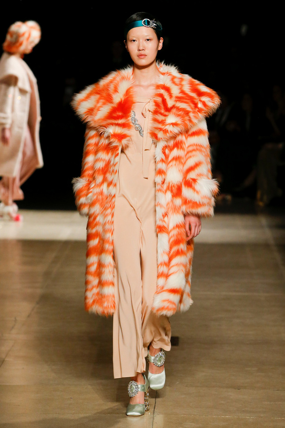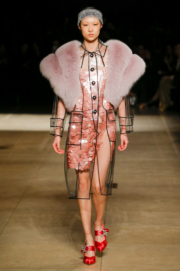 Miu Miu這一季的設(shè)計(jì)有融合各種族的女性和背景。毛茸茸的皮草,束腰外衣和閃亮的人造鉆石和亮片,還點(diǎn)綴這巨大的太陽眼鏡。